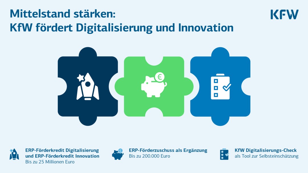 Mit den neuen Programmen „ERP-Förderkredit Digitalisierung“ und „ERP-Förderkredit Innovation“ entwickeln das Bundesministerium der Finanzen (BMF), das Bundesministerium für Wirtschaft und Energie (BMWE) und die KfW das Förderangebot für Unternehmen weiter. Die Förderung wird aus KfW-Mitteln getragen, die aus dem ERP-Sondervermögen (ERP = European Recovery Program) für die Mittelstandsförderung in das KfW-Eigenkapital eingebracht wurden.